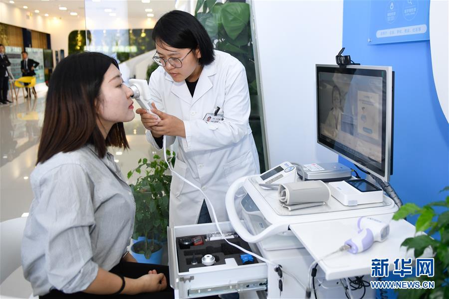 11月6日,参观者在乌镇互联网医院体验“智能医务室”的体检功能。据了解,“智能医务室”由智能移动医疗一体机、智能药柜以及一系列检查设备组成,根据健康档案和检查结果,视频连接家庭医生就能解决常见的医疗健康问题。 新华社记者黄宗治摄