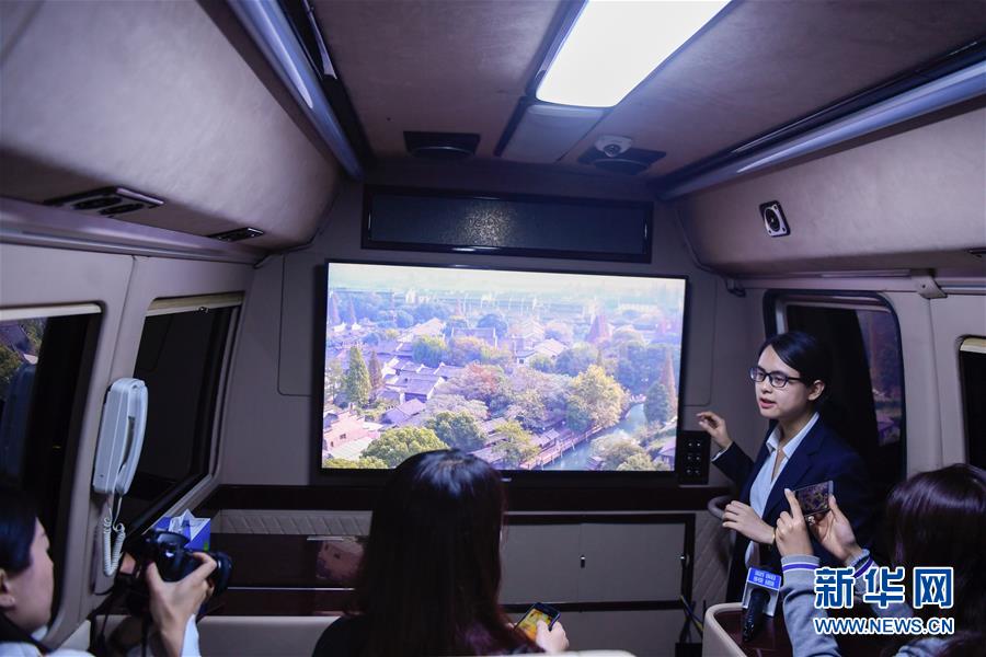 在浙江移动乌镇分水墩营业厅外,工作人员在一辆体验巴士内介绍通过5G移动传输技术实现的8K高清的视频画面实时展示(10月30日摄)。  新华社记者黄宗治摄