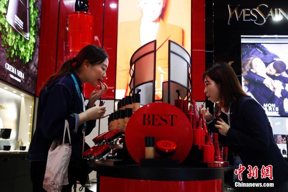 消费者在欧莱雅展台试妆。 汤彦俊 摄