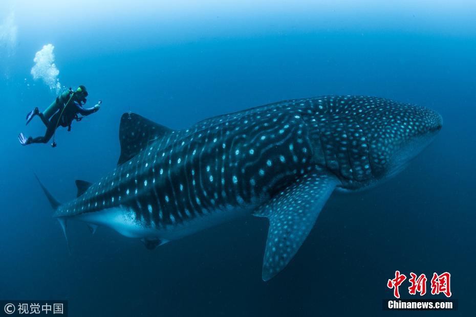 科学家水下与鲸鲨共舞 贴身“体检”提取研究样本