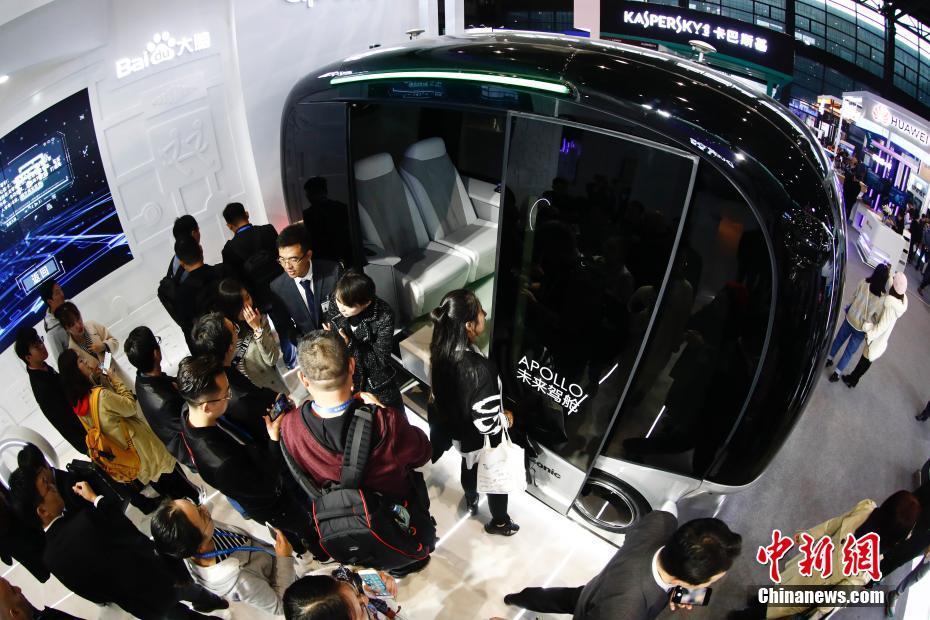 11月7日,在浙江乌镇举行的第五届世界互联网大会“互联网之光”博览会会场内,一辆名为“阿波龙”的无人驾驶汽车成为展会中的亮点。车身长4.3米,宽2米,共8个座位,核载14人(含6个站位)。这款车采用纯电动动力系统,最高时速可达120公里,满电情况下可以行驶约100公里。在车内,没有驾驶位和方向盘,整个车辆内部看起来像一个“半环抱”的沙发,坐在里面十分宽敞。通过车联网、人机交互技术,“阿波龙”不仅能听懂乘客指令,还能看懂乘客手势。中新社记者 杜洋 摄
