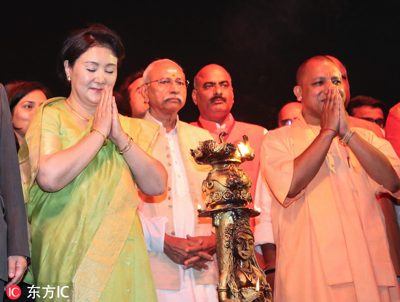 当地时间2018年11月6日,印度阿约提亚,正在该国访问的韩国“第一夫人”金正淑受邀出席排灯节庆祝,着印度女性传统服饰“沙丽”参加祈愿活动,点燃油灯为韩印两国友谊送上祝福。排灯节是印度的重要节日,印度家家户户当天都会点亮蜡烛或油灯庆祝。