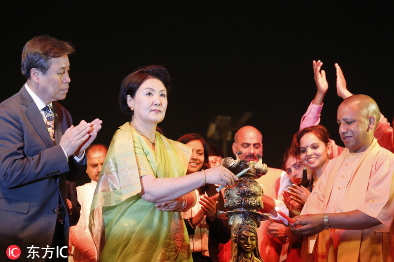 当地时间2018年11月6日,印度阿约提亚,正在该国访问的韩国“第一夫人”金正淑受邀出席排灯节庆祝,着印度女性传统服饰“沙丽”参加祈愿活动,点燃油灯为韩印两国友谊送上祝福。排灯节是印度的重要节日,印度家家户户当天都会点亮蜡烛或油灯庆祝。