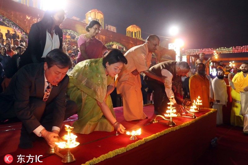 当地时间2018年11月6日,印度阿约提亚,正在该国访问的韩国“第一夫人”金正淑受邀出席排灯节庆祝,着印度女性传统服饰“沙丽”参加祈愿活动,点燃油灯为韩印两国友谊送上祝福。排灯节是印度的重要节日,印度家家户户当天都会点亮蜡烛或油灯庆祝。