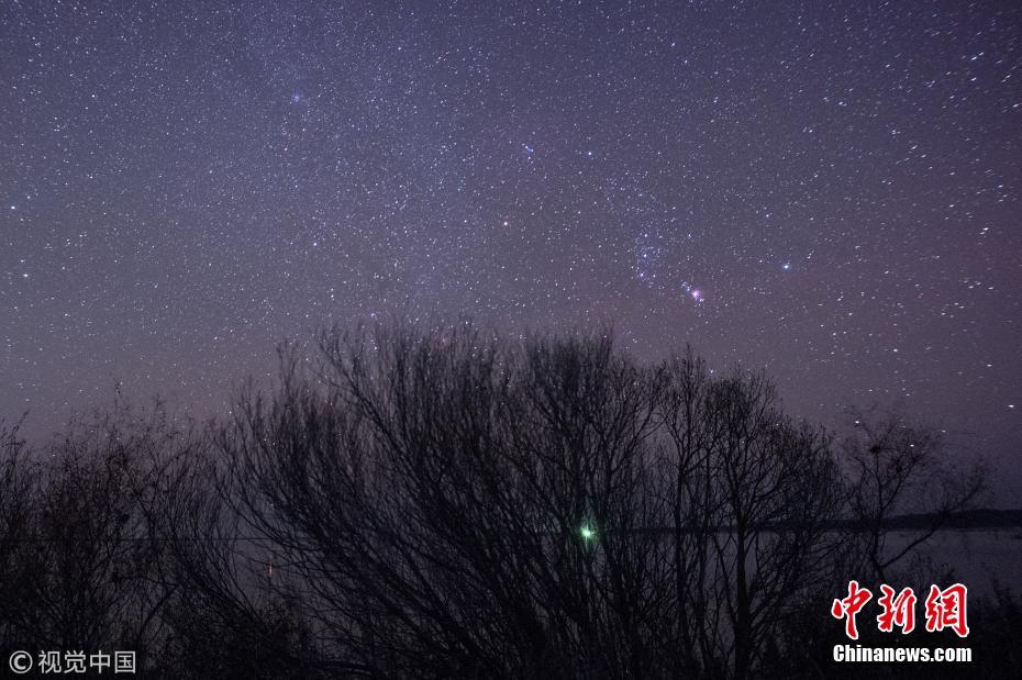 11月6日晚9点44分,黑龙江鸡西,猎户座移动到湖边树丛上空。(长曝)孙长山 摄