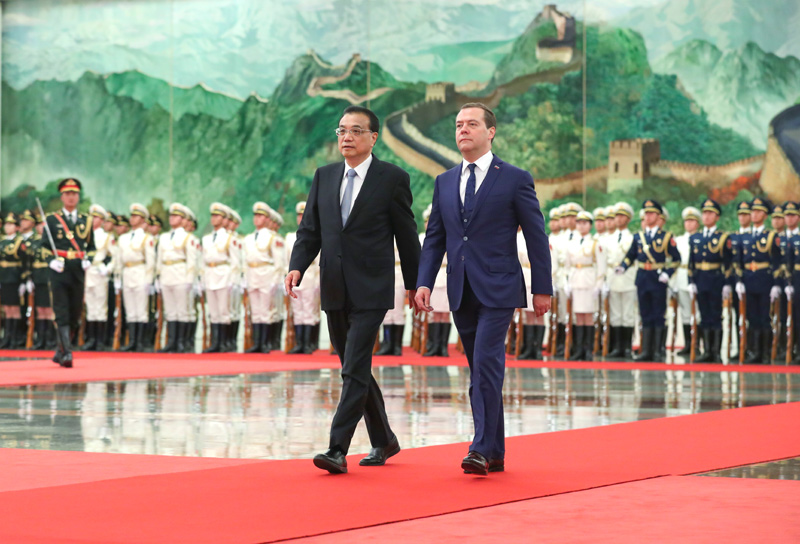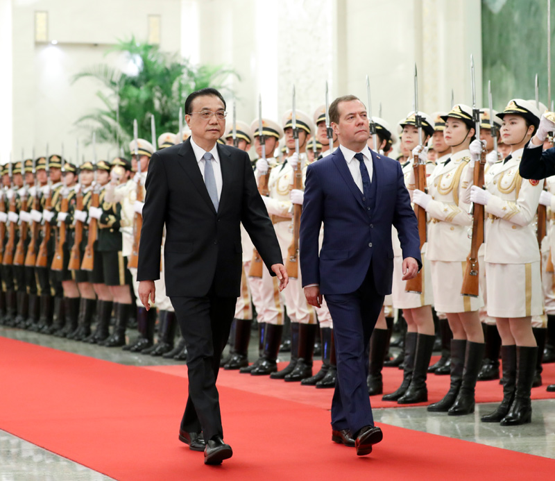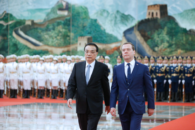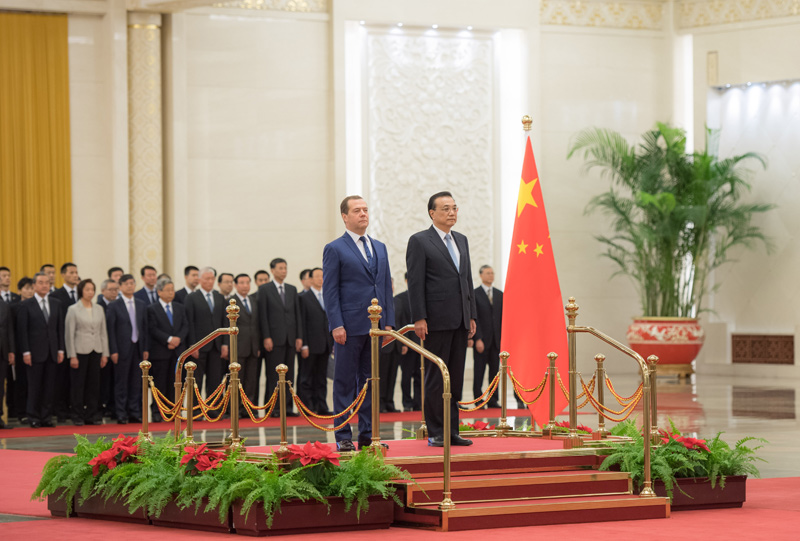 11月7日上午,国务院总理李克强在北京人民大会堂与俄罗斯总理梅德韦杰夫共同主持中俄总理第二十三次定期会晤。这是会晤前,李克强在人民大会堂北大厅为梅德韦杰夫举行欢迎仪式。