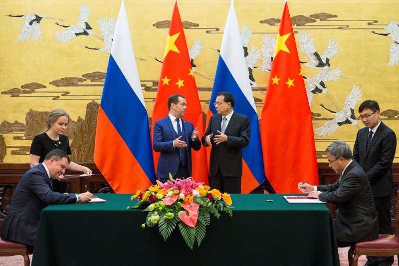 11月7日上午,国务院总理李克强在北京人民大会堂与俄罗斯总理梅德韦杰夫共同主持中俄总理第二十三次定期会晤。这是会晤后,李克强与梅德韦杰夫共同见证双边合作文件的签署。