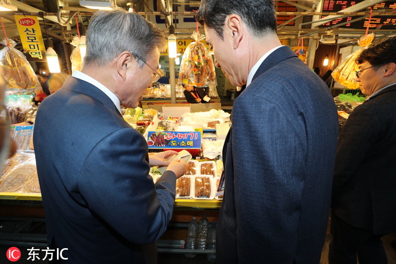 当地时间2018年11月8日,韩国浦项市,韩国总统文在寅走访浦项市一菜市场,与民众热情互动。