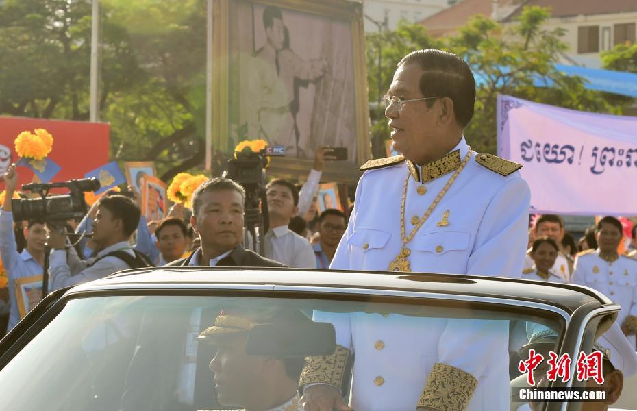 11月9日,柬埔寨首都金边举行盛大“独立日”庆典,庆贺国家独立65周年。1953年11月9日柬埔寨人民从法国殖民者手中夺回了国家主权,结束了近一百年的殖民统治。这一天正式成为柬埔寨独立日。图为柬埔寨首相洪森乘敞篷汽车参加庆典。中新社记者 黄耀辉 摄
