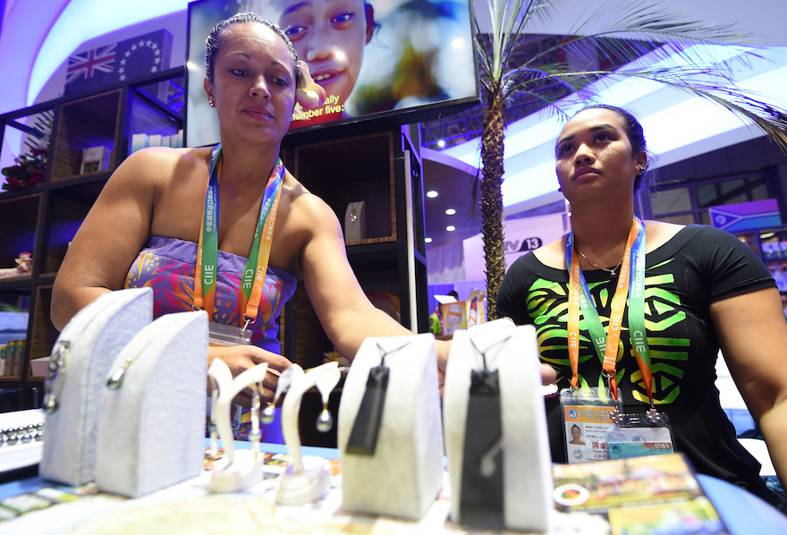 11月6日,太平洋岛国展区库克群岛展台的工作人员在摆放黑珍珠饰品。图片源于进博会官网
