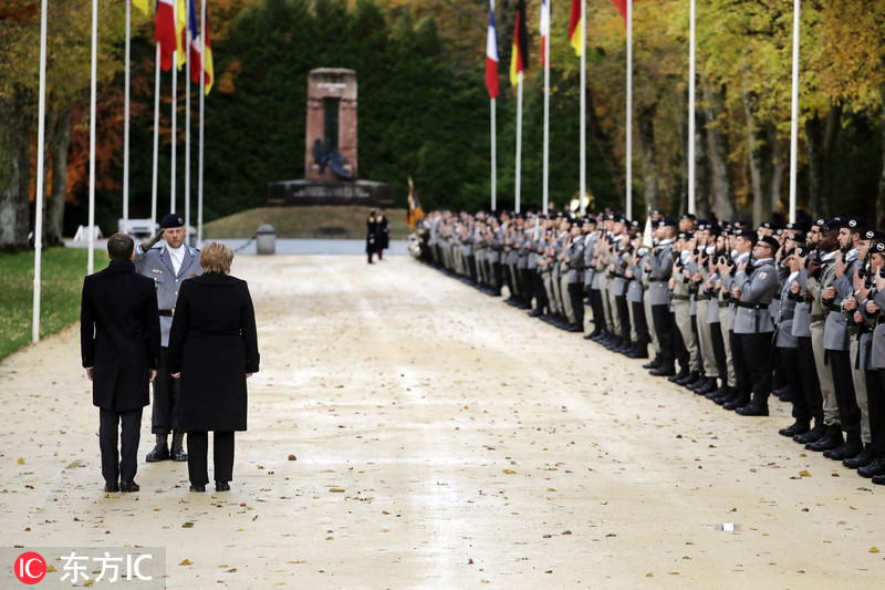 当地时间2018年11月10日,法国总统马克龙与德国总理默克尔共同在一战停战地贡比涅森林纪念一战结束100周年。