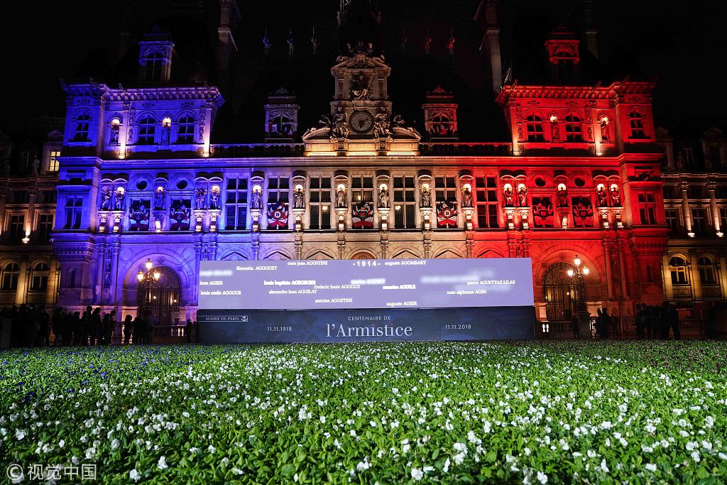 当地时间2018年11月10日,法国巴黎,巴黎市政厅举办一战结束百年纪念活动。94415朵蓝、白、红色花朵被摆放在市政厅前,纪念在一战中死在战场上的的94415名巴黎人。
