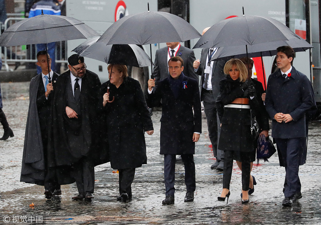 当地时间2018年11月11日,法国巴黎,第一次世界大战停战百年纪念活动在凯旋门举行。包括美国总统特朗普、俄罗斯总统普京在内的60多个国家领导人和国际机构负责人以及数十个国家的代表参加在凯旋门举行的纪念活动,马克龙会重新点燃凯旋门下的无名烈士墓长明火。