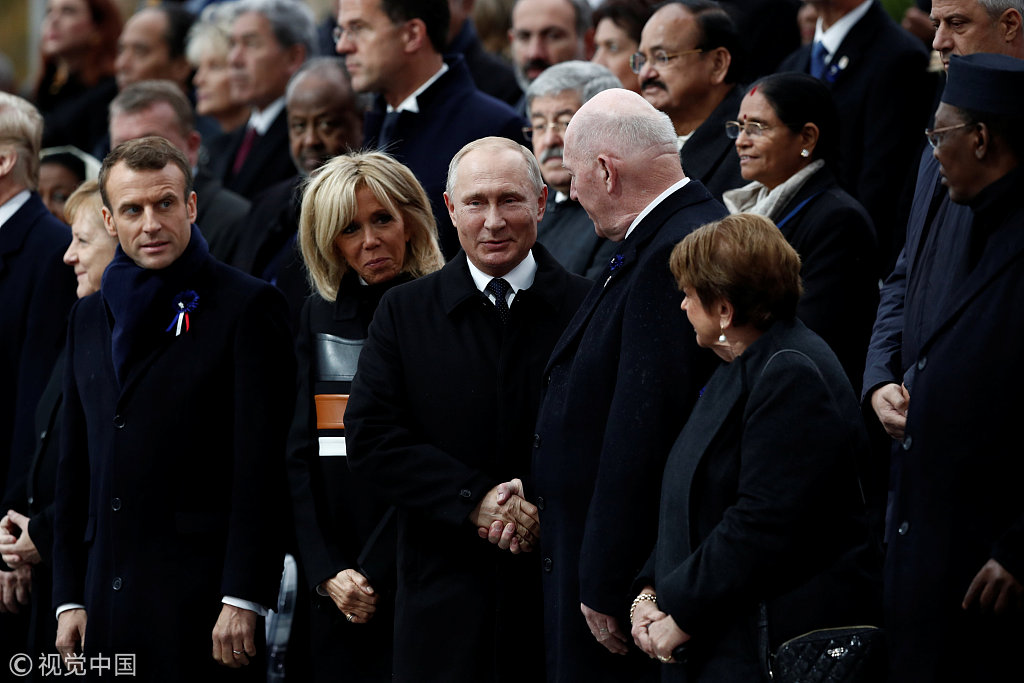 当地时间2018年11月11日,法国巴黎,第一次世界大战停战百年纪念活动在凯旋门举行。包括美国总统特朗普、俄罗斯总统普京在内的60多个国家领导人和国际机构负责人以及数十个国家的代表参加在凯旋门举行的纪念活动,马克龙会重新点燃凯旋门下的无名烈士墓长明火。
