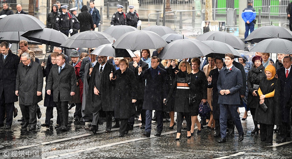 当地时间2018年11月11日,法国巴黎,第一次世界大战停战百年纪念活动在凯旋门举行。包括美国总统特朗普、俄罗斯总统普京在内的60多个国家领导人和国际机构负责人以及数十个国家的代表参加在凯旋门举行的纪念活动,马克龙会重新点燃凯旋门下的无名烈士墓长明火。