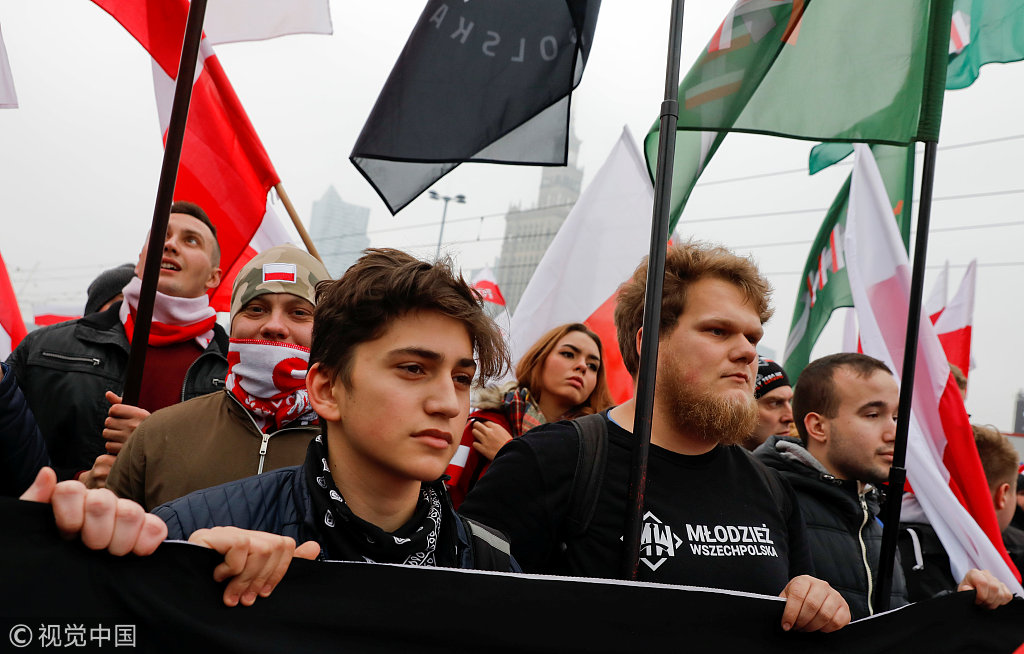 当地时间2018年11月11日,波兰华沙,民众参加独立游行,庆祝波兰恢复独立100周年。
