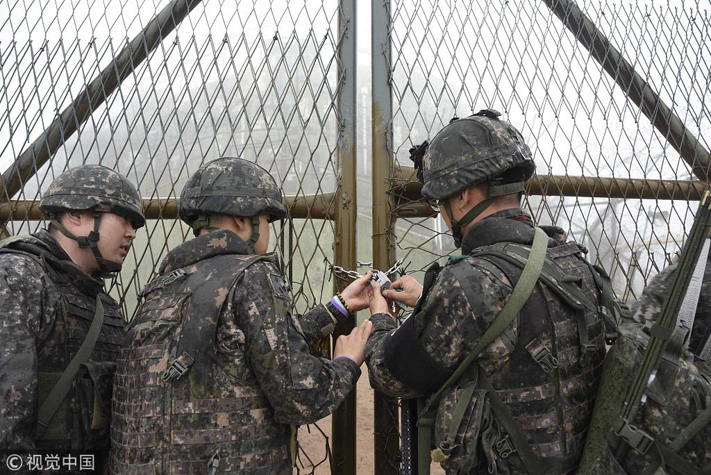 当地时间2018年11月11日,韩国,韩国国防部发布消息称,韩朝已从非军事区试点拆除的各自11处警备哨所中撤出全部武器和兵力,除双方各保留1处哨所外,将开始拆除其余所有哨所。图为韩国军人撤离非军事区试点拆除的警备哨所。