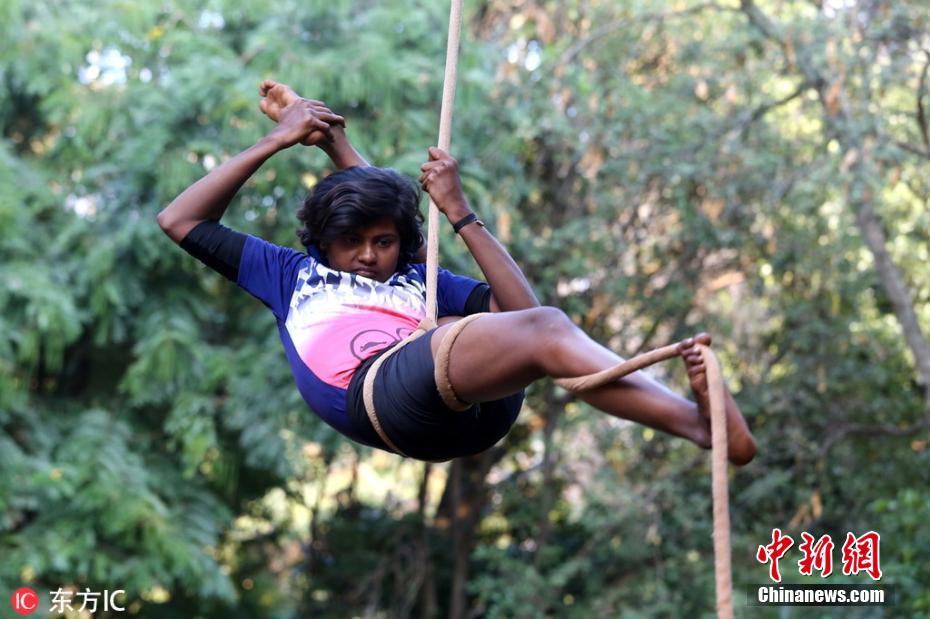 印度学生表演空中瑜伽 庆祝印度儿童节即将到来