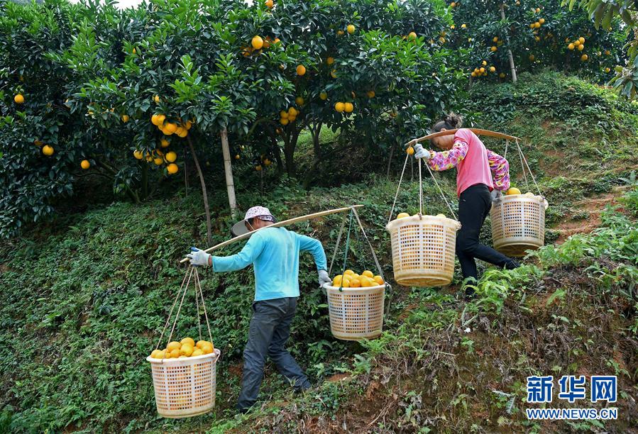 江西省寻乌县晨光镇桂花村的果农在挑运脐橙(11月10日摄)。新华社记者 万象摄