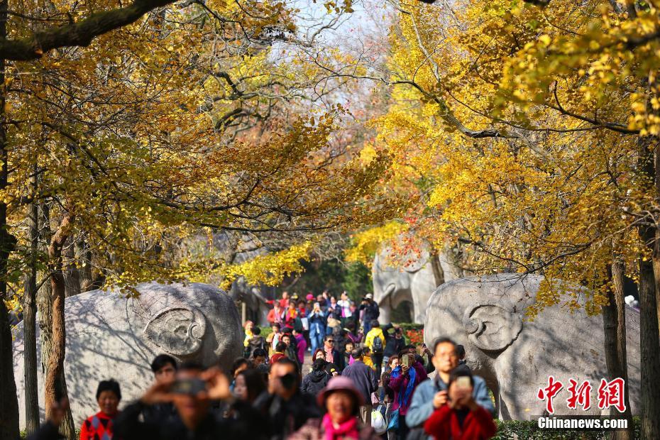 11月12日,市民和游客在南京紫金山明孝陵石象路上欣赏秋景。眼下的江南层林尽染,迎来“最美季”。中新社记者  泱波 摄