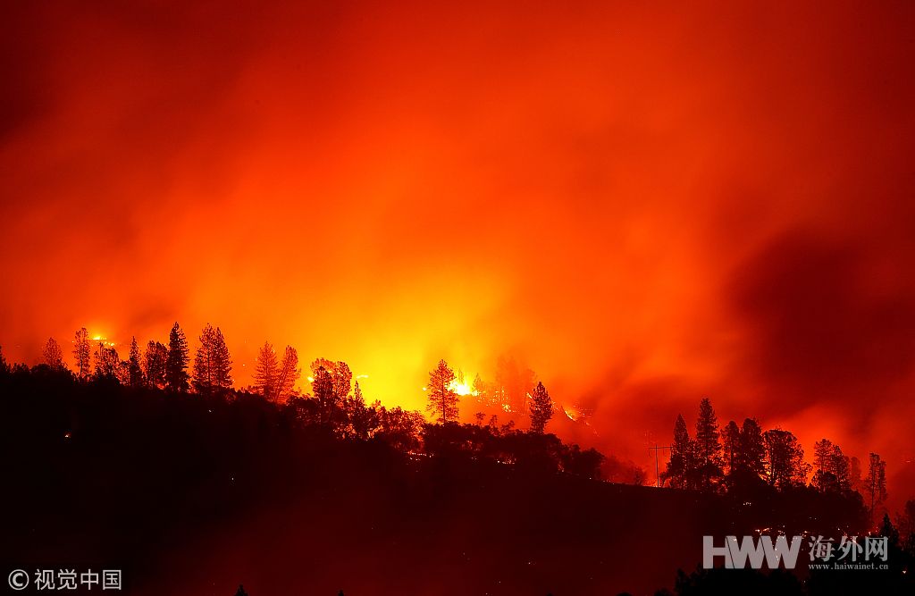 当地时间2018年11月11日,美国加州奥罗维尔,美国加州北部及南部山火持续,截至当地时间11日全州内的多起山火已致总计31人遇难,其中北部的“坎普”山火导致29人死亡。