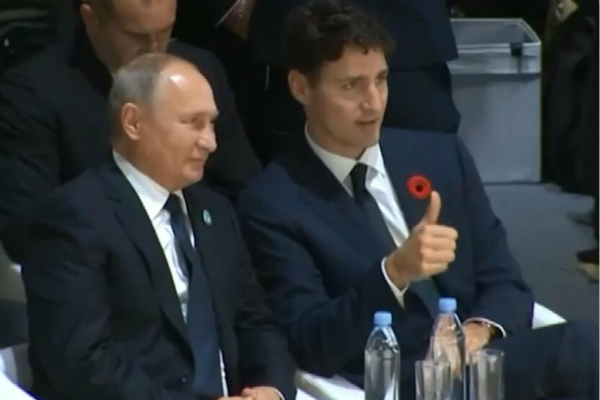 特鲁多冲普京竖起大拇指。(图:视频截图)