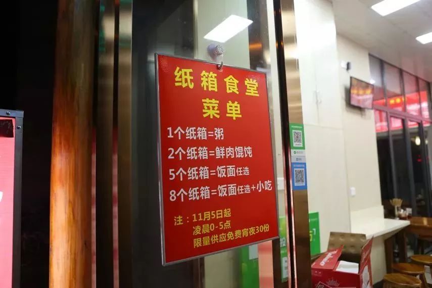 有意思的是,不同个数的纸箱还能换取不同的宵夜套餐,1个纸箱换一碗热粥,2个纸箱换一碗鲜肉馄饨,凭5个纸箱可以饭面任选等,为加班夜归的上班族、外卖员、快递小哥、环卫工人等带去一份温暖。