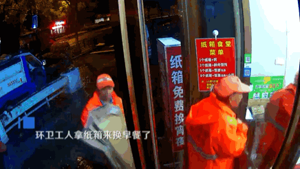 天蒙蒙亮时,视频中出现了一群环卫工人,他们将一叠纸箱整齐地放在回收箱边,来换取早餐。老板很快为他们端上了热气腾腾的面,并与他们攀谈起来。