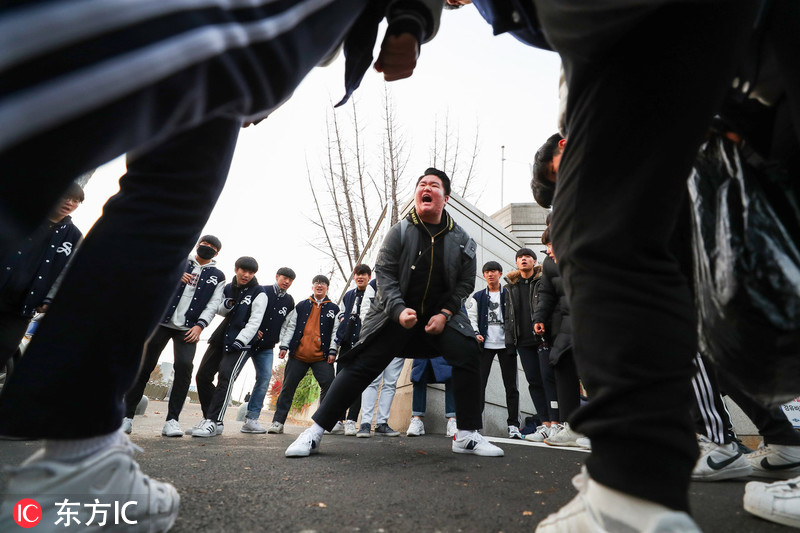 当地时间2018年11月15日,韩国首尔、春川、浦项市,2019韩国大学入学考试第一天,韩国各地考生赶赴考生,学生家长陪同送考为考生加油大气,更有考生后辈在考场外跪地祝福学长学姐“高考”顺利。
