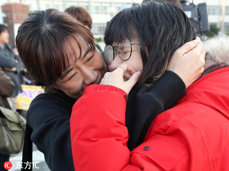 当地时间2018年11月15日,韩国首尔、春川、浦项市,2019韩国大学入学考试第一天,韩国各地考生赶赴考生,学生家长陪同送考为考生加油大气,更有考生后辈在考场外跪地祝福学长学姐“高考”顺利。