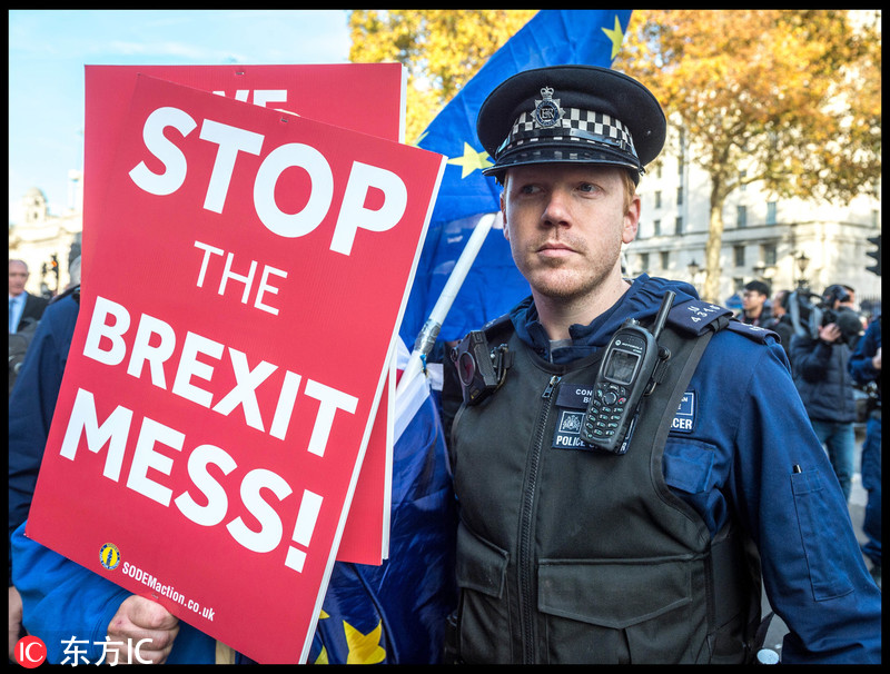 当地时间2018年11月14日,英国伦敦,民众聚集在唐宁街,抗议英国脱欧协议获得内阁支持。