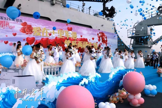 威武的999舰,象征着长长久久,军装与婚纱相映成趣。