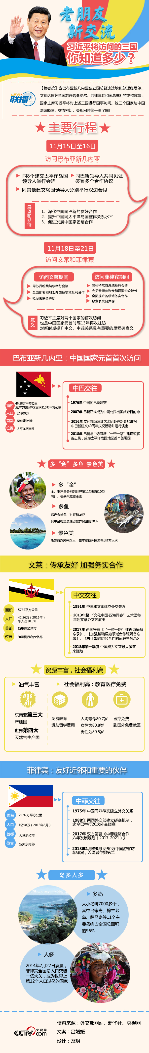 【联播+】11月15日至16日、18日至21日,习近平主席将对巴布亚新几内亚、文莱、菲律宾进行国事访问,并在巴新同建交太平洋岛国领导人会晤。习近平主席此次访问将进一步加深中国与上述三国及建交太平洋岛国的政治互信,深化友谊,为双边关系发展注入新活力,谱写亚太合作新篇章。央视网《联播+》栏目,图解此访主要行程,带您了解这三个国家与中国的渊源交流。