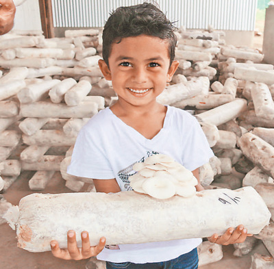 斐济当地儿童展示自家用菌草种出的蘑菇。本报记者 曲翔宇摄
