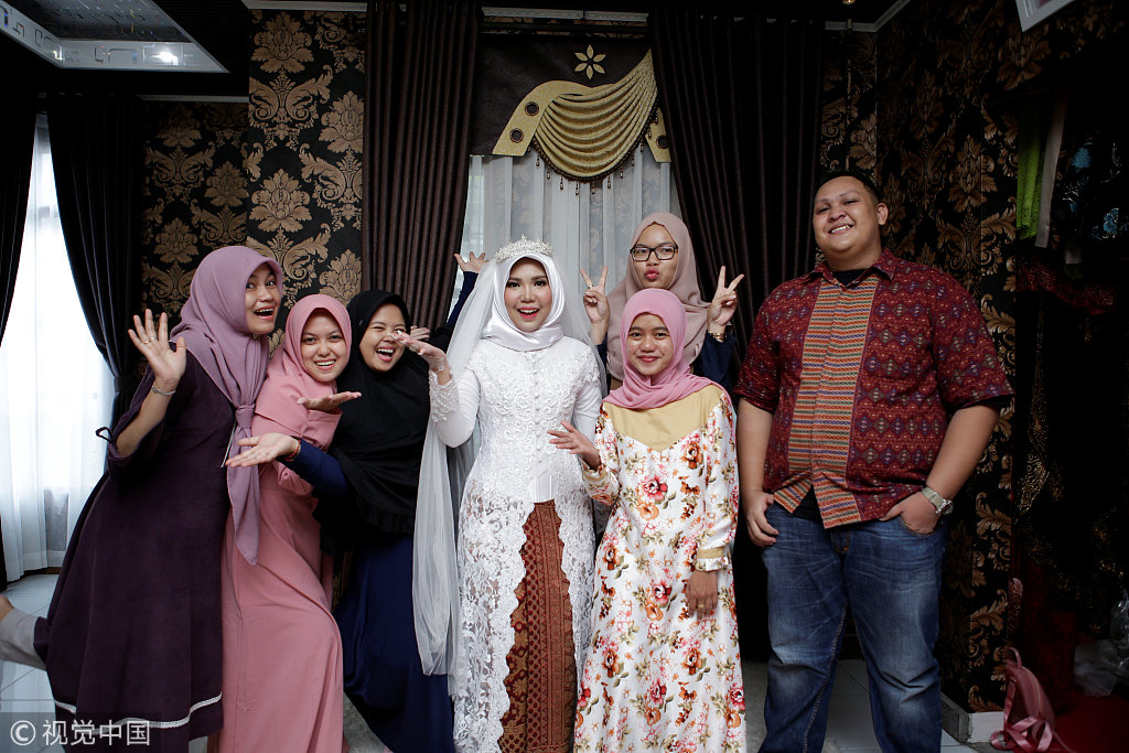 狮航坠毁后,印尼狮航JT610航班遇难乘客里约普拉塔玛·南达的未婚妻独自举行了婚礼,婚礼上,亲友们和她在一起。图片来源:视觉中国