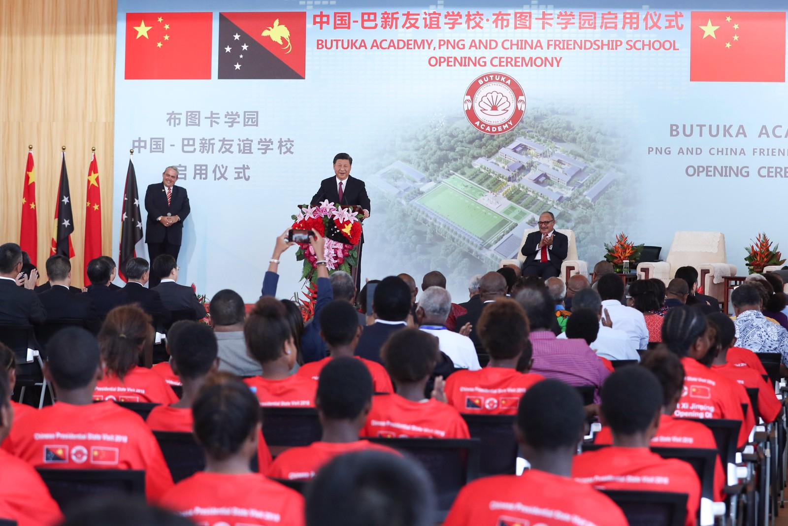 国家主席习近平16日在莫尔兹比港和巴布亚新几内亚总理奥尼尔共同出席中国援建的布图卡学园启用仪式。(文/人民日报客户端 图/新华社)