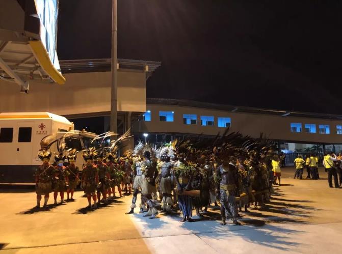 当地时间11月15日下午,身着民族服装的当地民众就来到了莫尔斯比港杰克逊机场,等待习主席专机到来。