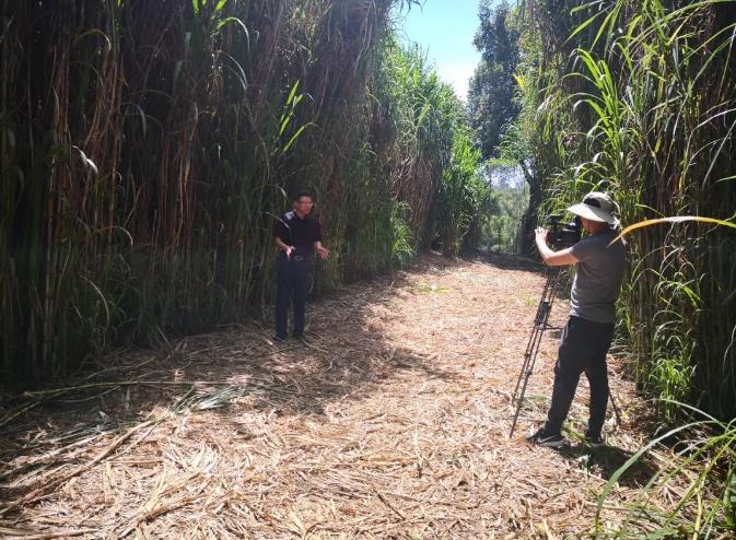 △央视记者身后是近8米高的巨菌草。它既可做食用菌的菌料,也可做家畜饲料、沼气和造纸原料。(央视记者刘年拍摄)