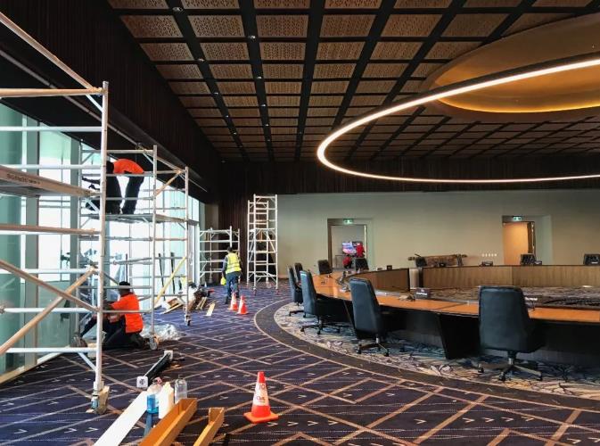 △APEC第二十六次领导人非正式会议将在这个会议室举行。工人们正在会场做最后的装饰。(央视记者拍摄)