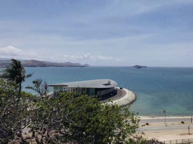 △APEC大厦位于莫尔斯比港海滨。远看像当地土著居民的古老木舟。(央视记者吉彬拍摄)