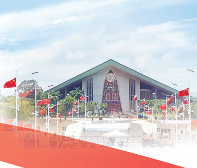 巴布亚新几内亚议会大厦前的独立大道两侧,中巴新两国国旗迎风飘扬。本报记者 李 锋摄