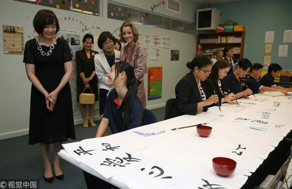 安倍夫人观看学生写毛笔字,面带笑容