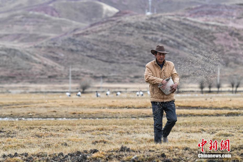 西藏林周县野保员顿珠次仁为越冬黑颈鹤喂食。中新社记者 何蓬磊 摄