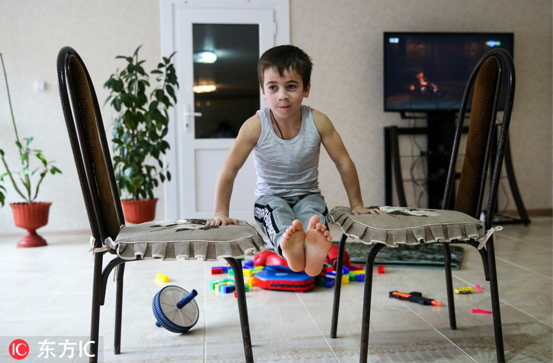 当地时间2018年11月15日,俄罗斯车臣共和国,Rakhim Kurayev居住在车臣共和国沙里区Duba-Yurt小村庄,今年5岁的Rakhim天生热爱运动又活力十足,他创下了2小时25分钟做4105个俯卧撑的纪录。但当时在场的俄罗斯纪录官员拒绝承认这一纪录,因为他们没有遵守所有的认证手续。 Yelena Afonina/东方IC