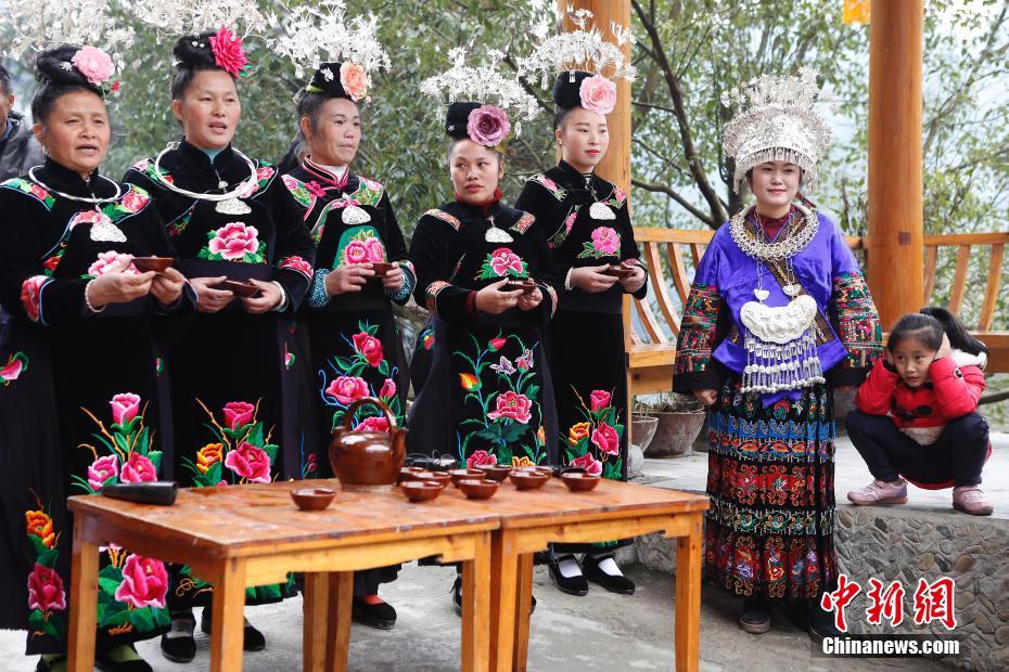 11月18日,贵州省黔东南三棵树南华村苗族村寨,苗族同胞身穿特色服装庆祝苗族新年。中新社记者 殷立勤 摄