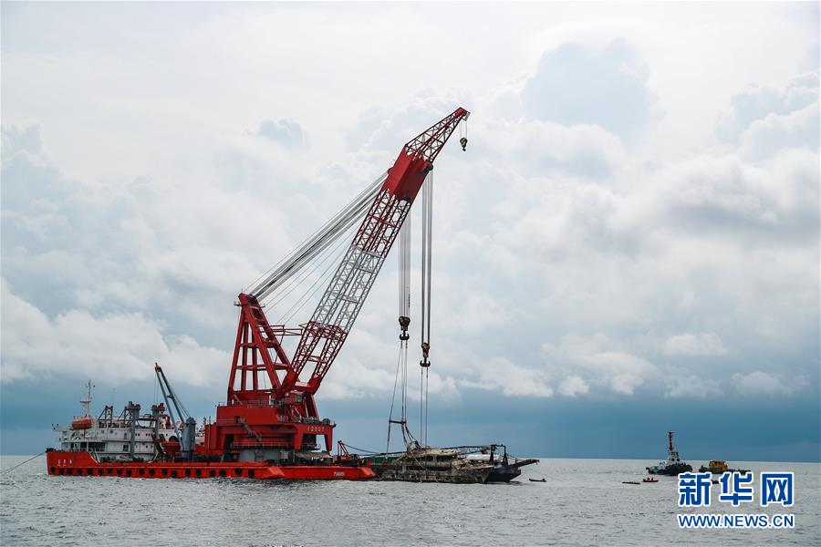 11月18日,在普吉岛附近海域,工作人员将打捞出水的“凤凰”号游船拖离事发水域,转移上岸。泰国旅游和体育部部长威拉萨18日在泰国普吉视察游船倾覆事故中沉没的“凤凰”号的打捞情况时说,泰方将把“凤凰”号转移上岸并封锁船体,以便开展调查。新华社记者 张可任 摄