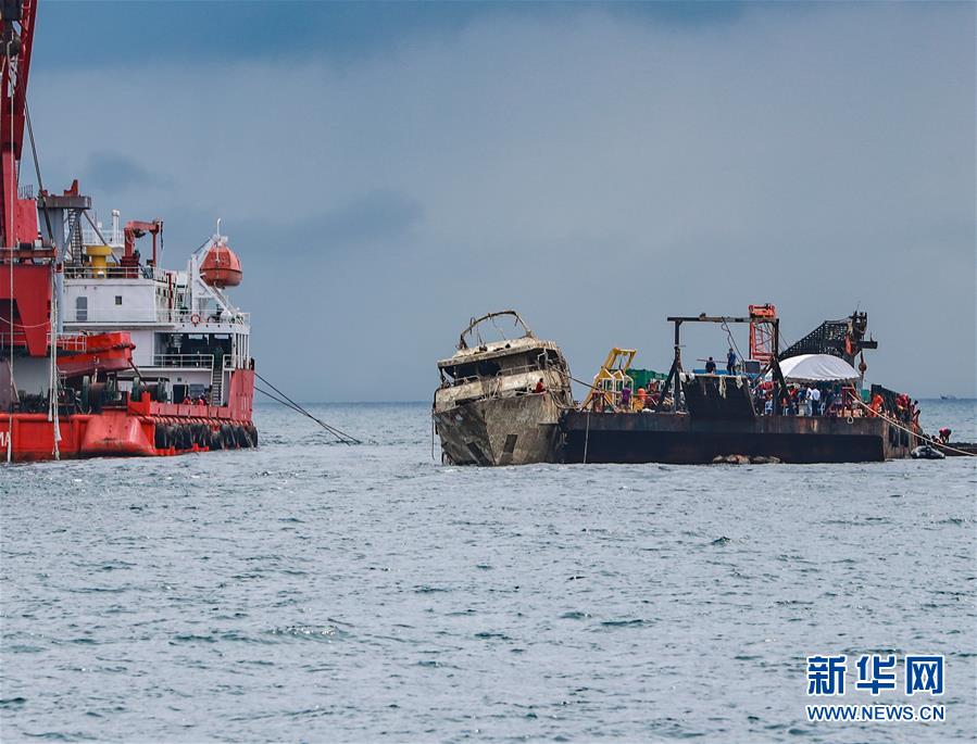 11月18日,在普吉岛附近海域,工作人员将打捞出水的“凤凰”号游船拖离事发水域,转移上岸。泰国旅游和体育部部长威拉萨18日在泰国普吉视察游船倾覆事故中沉没的“凤凰”号的打捞情况时说,泰方将把“凤凰”号转移上岸并封锁船体,以便开展调查。新华社记者 张可任 摄