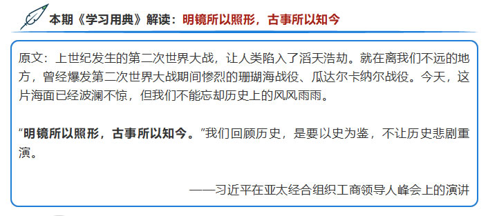 在说到“如何才能为世界经济发展把握正确方向?如何才能为国际社会找到有效治理思路?”时,习近平使用了典故“明镜所以照形,古事所以知今”。