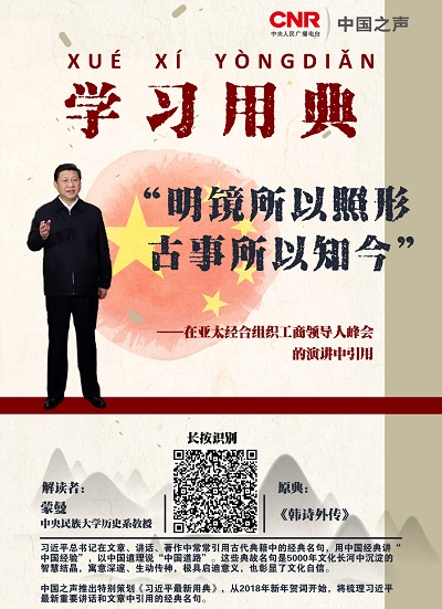 今天的《习近平最新用典》,解读习近平主席在亚太经合组织工商领导人峰会上的演讲中使用的“明镜所以照形,古事所以知今”。解读嘉宾:中央民族大学历史系教授蒙曼。