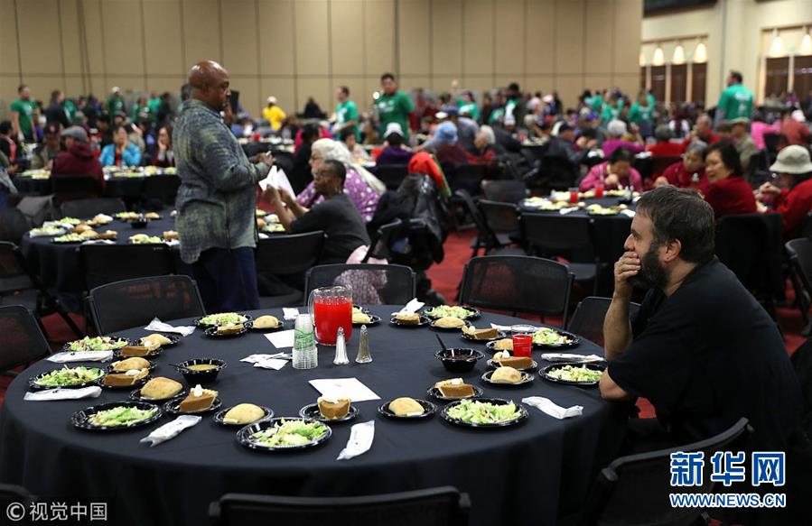当地时间2018年11月20日,美国加利福尼亚州奥克兰市,当地举办第27届感恩节晚宴,为需要帮助的人提供免费食物。